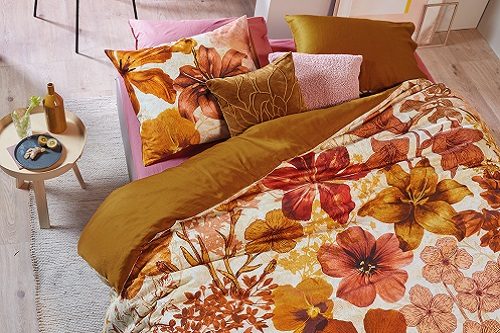 De story Abloom neemt je mee naar het Victoriaanse tijdperk. De dekbedovertrekken bevatten rijk gekleurde botanische prints en banen dessins. Het warme kleurenpalet van olijfgroen met karamel accenten past heel goed in de tijd van het jaar.