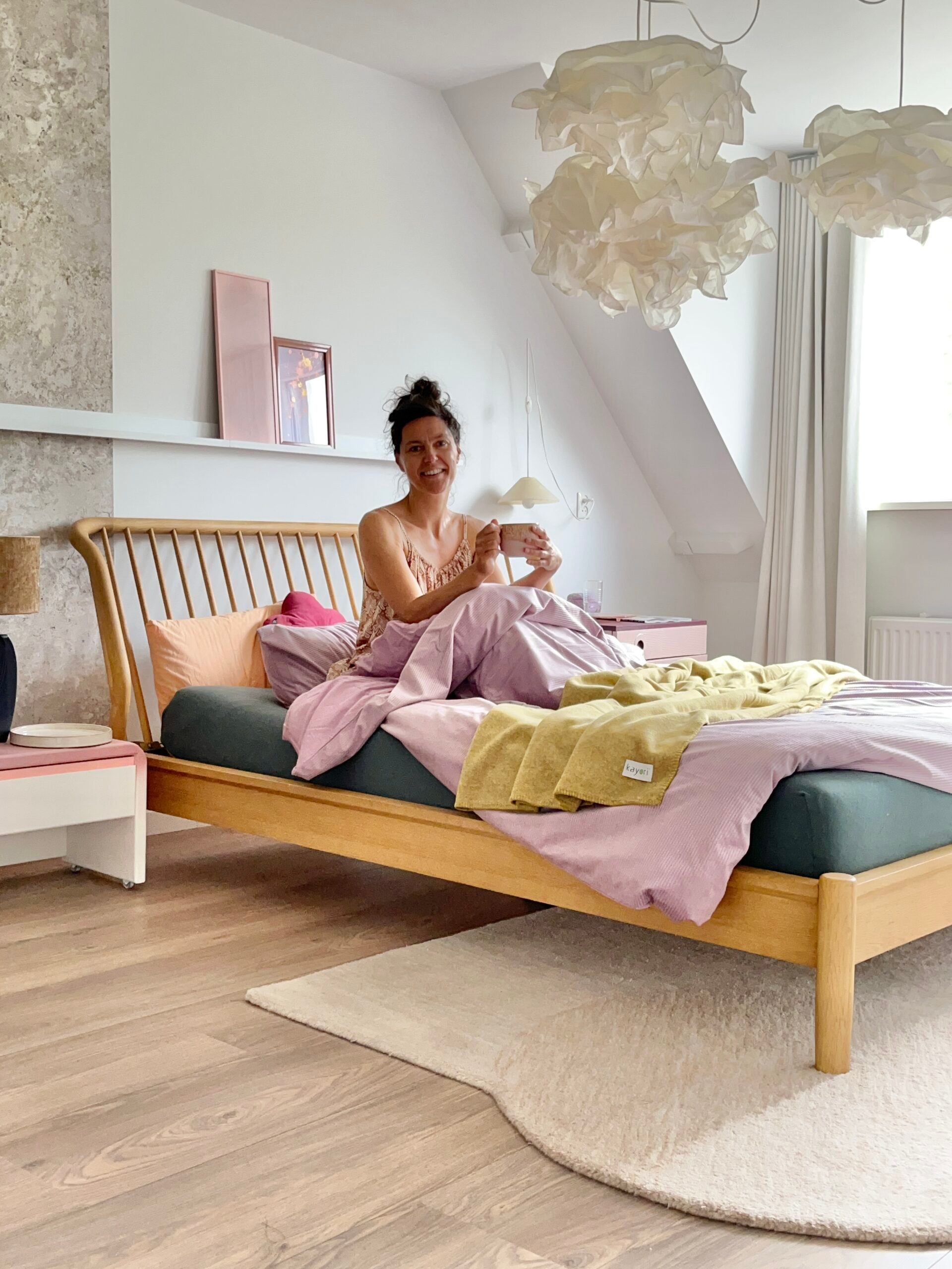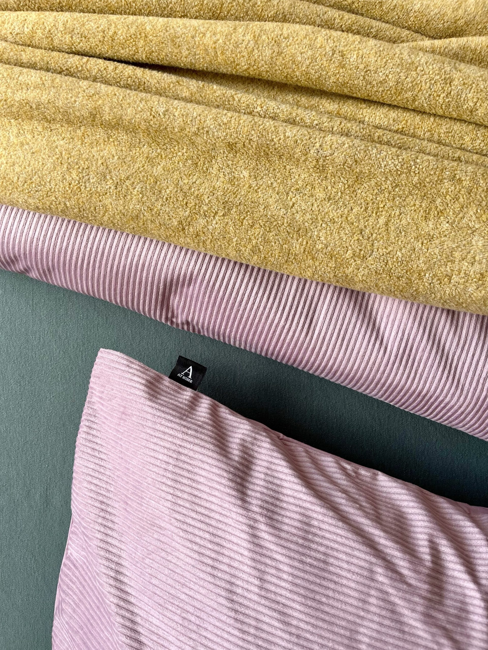 Wanneer het aankomt op beddengoed, maakt Hilde een mix van praktische en esthetische overwegingen. “Qua beddengoed is mijn vriend van de praktische eisen: het moet zacht aanvoelen én overtrekken moeten goed passen, zodat je dekbed niet wegzakt. Daar sluit ik me helemaal bij aan, maarrr… ik ben ook het ‘het oog wil oog wat’-type en gebruik daarom graag verschillende stofjes, structuurtjes en af en toe een print door elkaar om een aantrekkelijk ‘nestje te bouwen’.” Hilde koos dan ook voor het At Home Corduroy dekbedovertrek met een voorzijde van mini ribfluweel, een chique stof die in combinatie met het trendy lila een eveneens speelse twist krijgt. Voor extra kleur combineerde ze dit met het groene Snoozing dubbel jersey hoeslaken en het Kayori Sagano plaid in de kleur goud, voor een sfeervolle en luxe uitstraling.