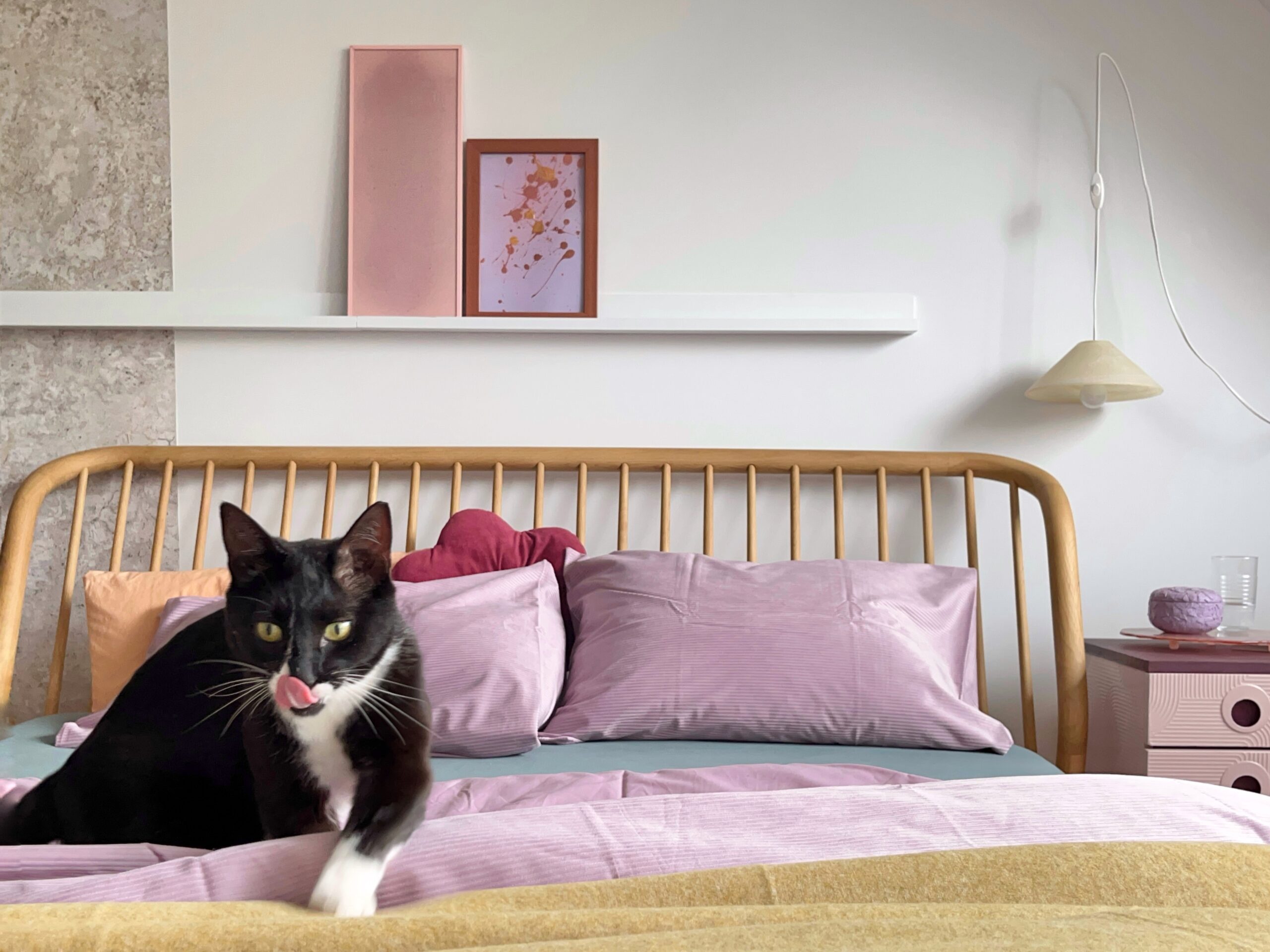 Het opknappen van meubels is een andere creatieve uitlaatklep voor Hilde. “Een iets grotere DIY in de slaapkamer is het nachtkastje links naast het bed. Het was een oud, vies, vergeeld geval, maar door z’n afgeronde hoeken heel cool qua vorm. Met witte spraypaint friste ik ‘m op, en met roze spraypaint bracht ik een fade effect aan. Nu is het een opvallend kastje geworden”, legt ze uit.
