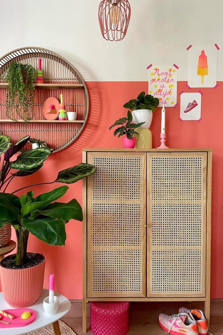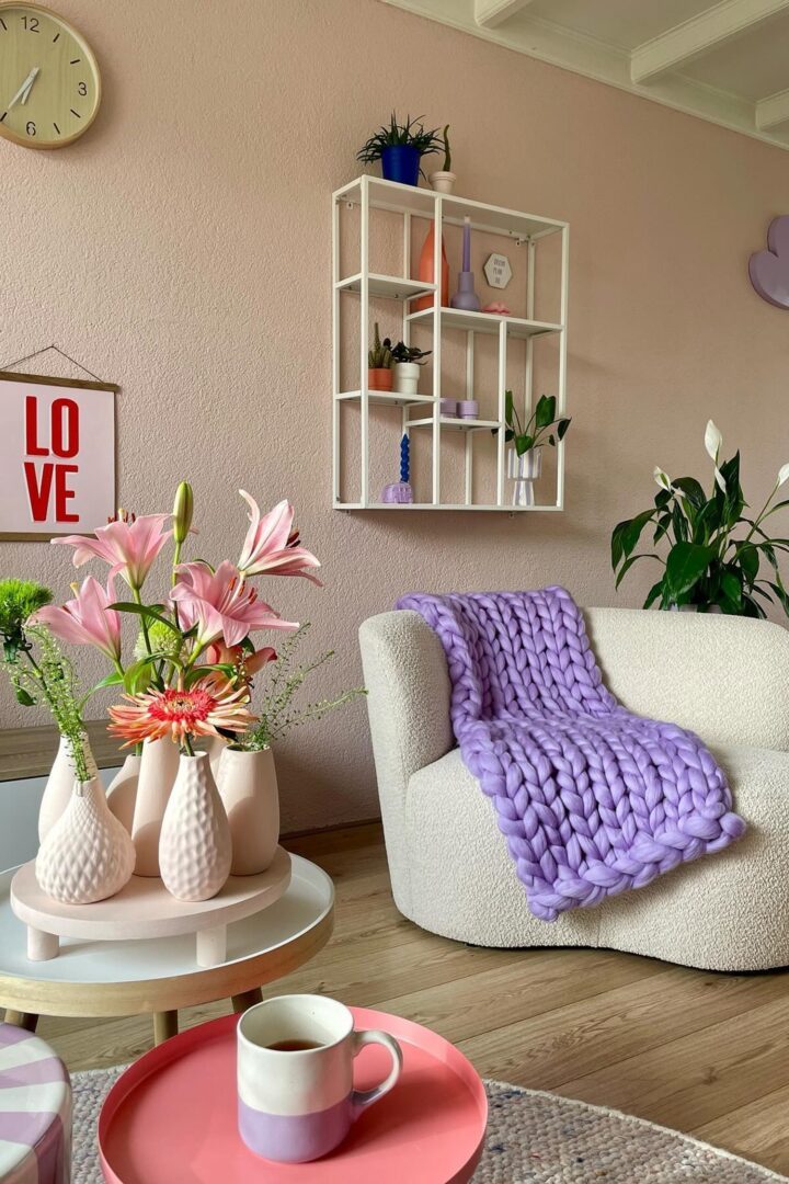 “Ik vind het lastig om mijn woonstijl te omschrijven”, geeft Jeanet toe. “Maar als ik het in een paar woorden zou moeten zeggen, dan zou ik zeggen; hip, modern en kleurrijk. Een vrolijke kleurexplosie met een vleugje humor.” Volgens haar volgers op Instagram varieert haar stijl van eclectisch tot sweet Scandinavisch. De unieke stijl is ook duidelijk terug te vinden in haar slaapkamer, waar zachte pasteltinten zoals roze, koraal en lila samenkomen. Welke woontrend vind jij het beste passen bij Jeanet’s interieur?