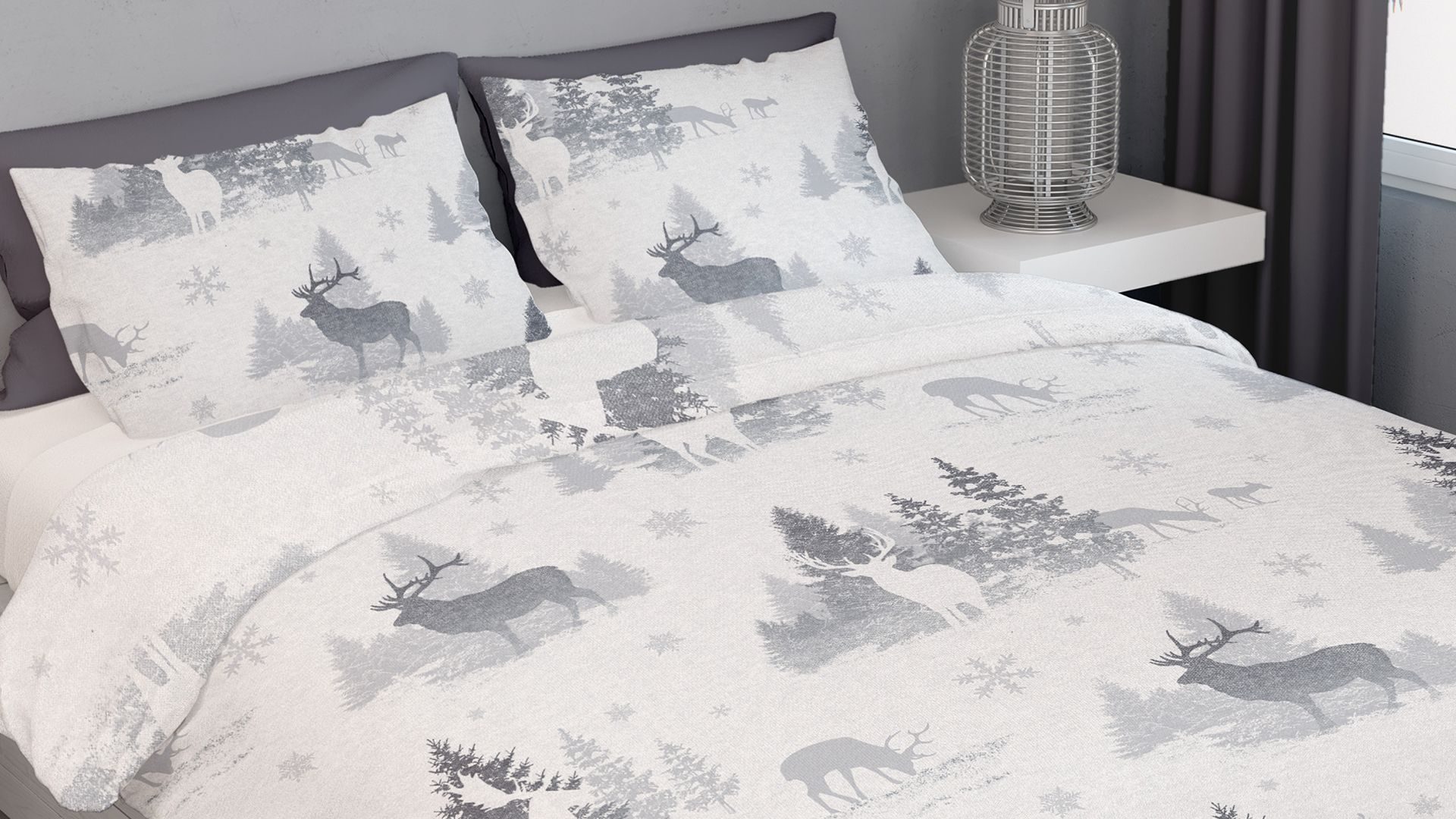 Houd je het liever iets rustiger? Dit prachtige Snowdear overtrek met winterse print, waarin herten, dennenbomen en sneeuwkristallen in grijstinten elkaar afwisselen, brengt kalmte en rust in jouw slaapvertrek. Met het flanellen dekbedovertrek creëer je moeiteloos een knusse wintersfeer in de slaapkamer!