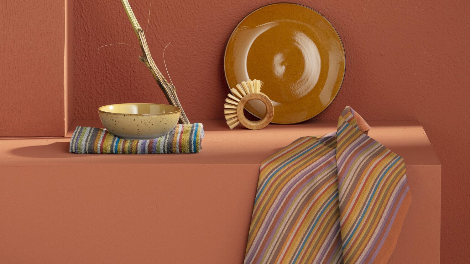 Meer kleur? Met de Over the Rainbow keukendoek geef je jouw keuken een vrolijke boost. Het streepmotief combineert warme terra- en okertinten met speelse accenten in paars, blauw en wit. Handig voor het snel afdrogen van je handen, maar ook stevig genoeg om warme schalen veilig naar tafel te dragen. Praktisch én een feest voor het oog!