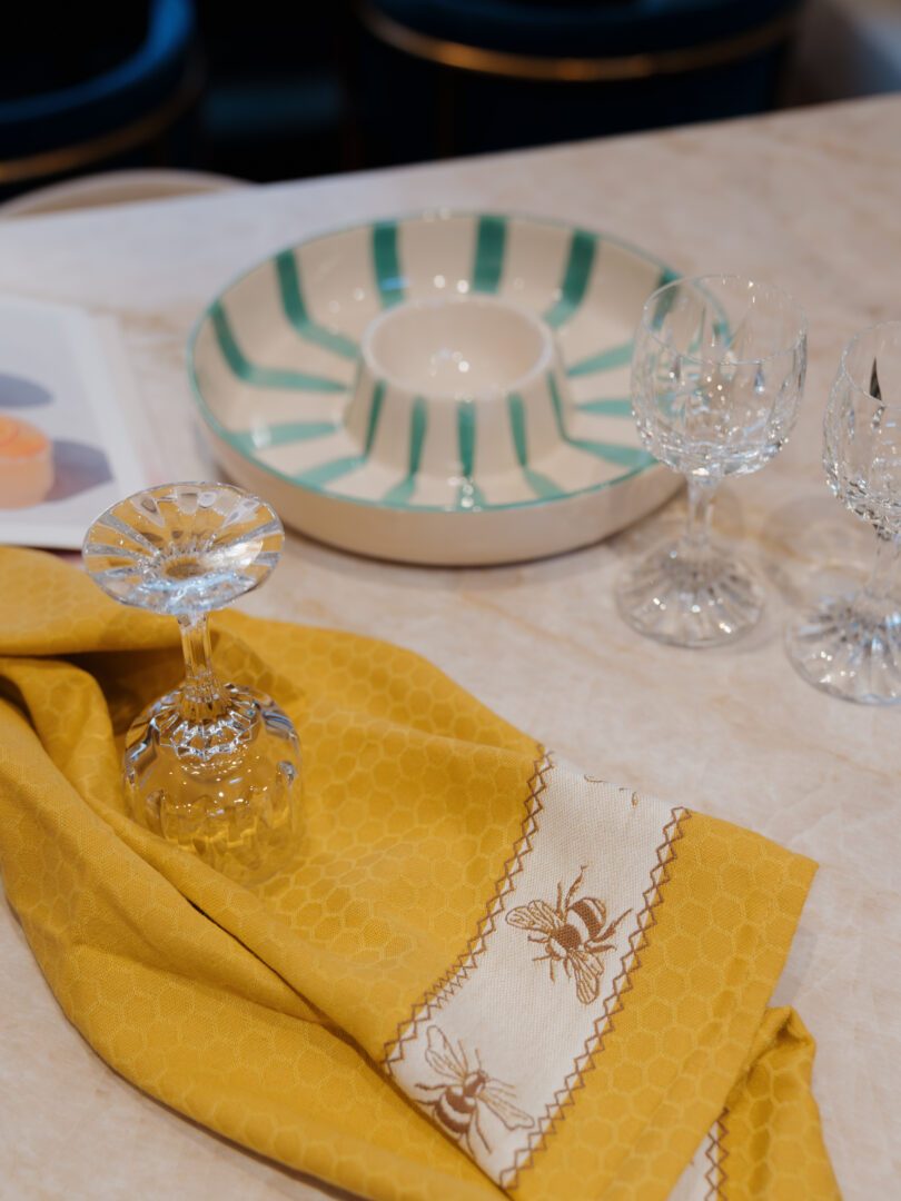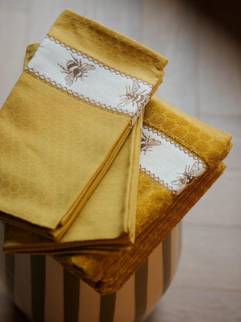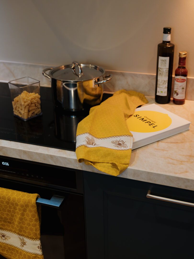 Voor wie van kleur houdt, heeft DDDDD twee echte blikvangers. De Bees collectie en Over the rainbow! Madelief heeft de Bees theedoeken prachtig gecombineerd in haar keuken. Breng de natuur naar binnen met de DDDDD Bees theedoek in warm okergeel. De subtiele honingraatstructuur, licht afgewerkte randen en speelse bijen geven een stijlvolle, natuurlijke uitstraling.