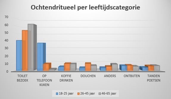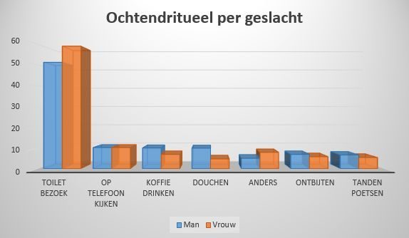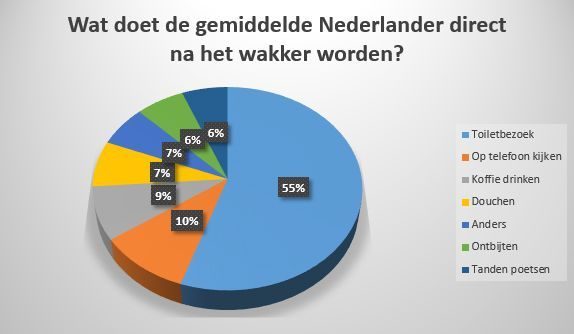 Anno 2015 gaan de meeste Nederlanders direct na het wakker worden eerst naar het toilet. Dit doet 55% van de ondervraagden. Het zal je niet verwonderen dat het nog maar de vraag is of dit in de toekomst nog steeds zo zal zijn. Bijna 40% van de jongeren geeft aan na het wakker worden eerst zijn mobiele telefoon te pakken. Ter vergelijking: in de categorie 46-65 jaar doet nog geen 2% dat… Een andere opvallende uitkomst is dat er meer mannen meteen gaan douchen nadat ze wakker zijn geworden dan vrouwen.