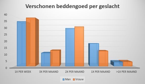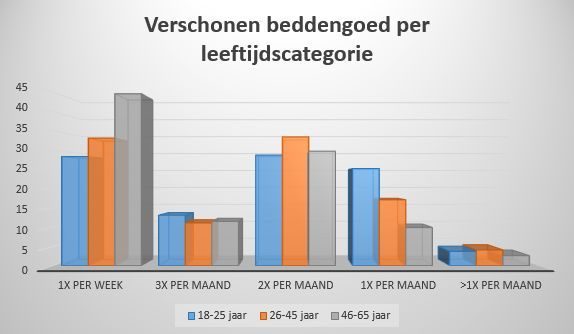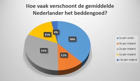 Nederlanders zijn opvallend schoon als het om het beddengoed gaat. Bijna 40% van de ondervraagden verschoont zijn bed één keer per week. Of dit over dertig jaar nog steeds het geval is, is nog maar de vraag. Bij de jongeren ligt dit percentage op nog geen 30% ten opzichte van 45% bij de ouderen. Dat Nederlanders zo vaak het beddengoed verschonen kan te maken hebben met het toelaten van huisdieren in bed. Van alle huisdierenbezitters heeft bijna de helft daar geen problemen mee.
