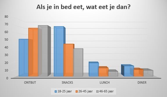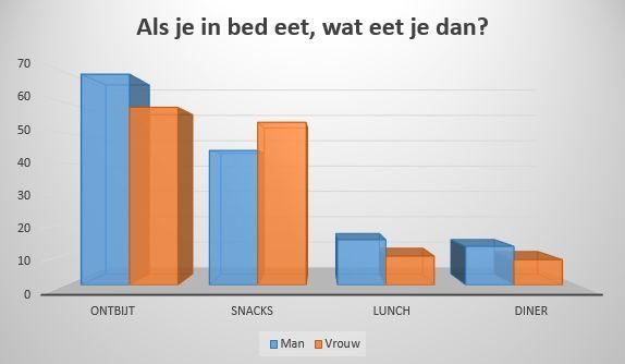Een ontbijt op bed is natuurlijk iedereen wel bekend, maar snacken of zelfs dineren in bed is minder ingeburgerd. Toch gebeurt dat. Van de mensen die aangeven wel eens in bed te eten nuttigt bijna 13% wel eens zijn avondeten in bed. Uiteraard is een ontbijt eten in bed het populairst. Dat dit een typische vrouwenaangelegenheid is wordt door dit onderzoek onderuit gehaald, want het zijn juist de mannen die vaker ontbijt op bed eten.