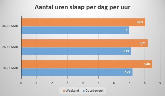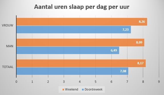 Er wordt vaak gezegd dat acht uur slaap per dag het beste is. Uit het onderzoek blijkt dat de doorsnee Nederlander daar op doordeweekse dagen niet aan komt. Vrouwen komen gemiddeld net niet tot 7,5 uur, mannen halen zelfs de 7 uur niet. In het weekend slapen we een uur langer. Het hebben van kinderen heeft uiteraard invloed op de nachtrust: zowel doordeweeks als in het weekend slapen mensen met kinderen ongeveer een halfuur minder dan mensen zonder kinderen.