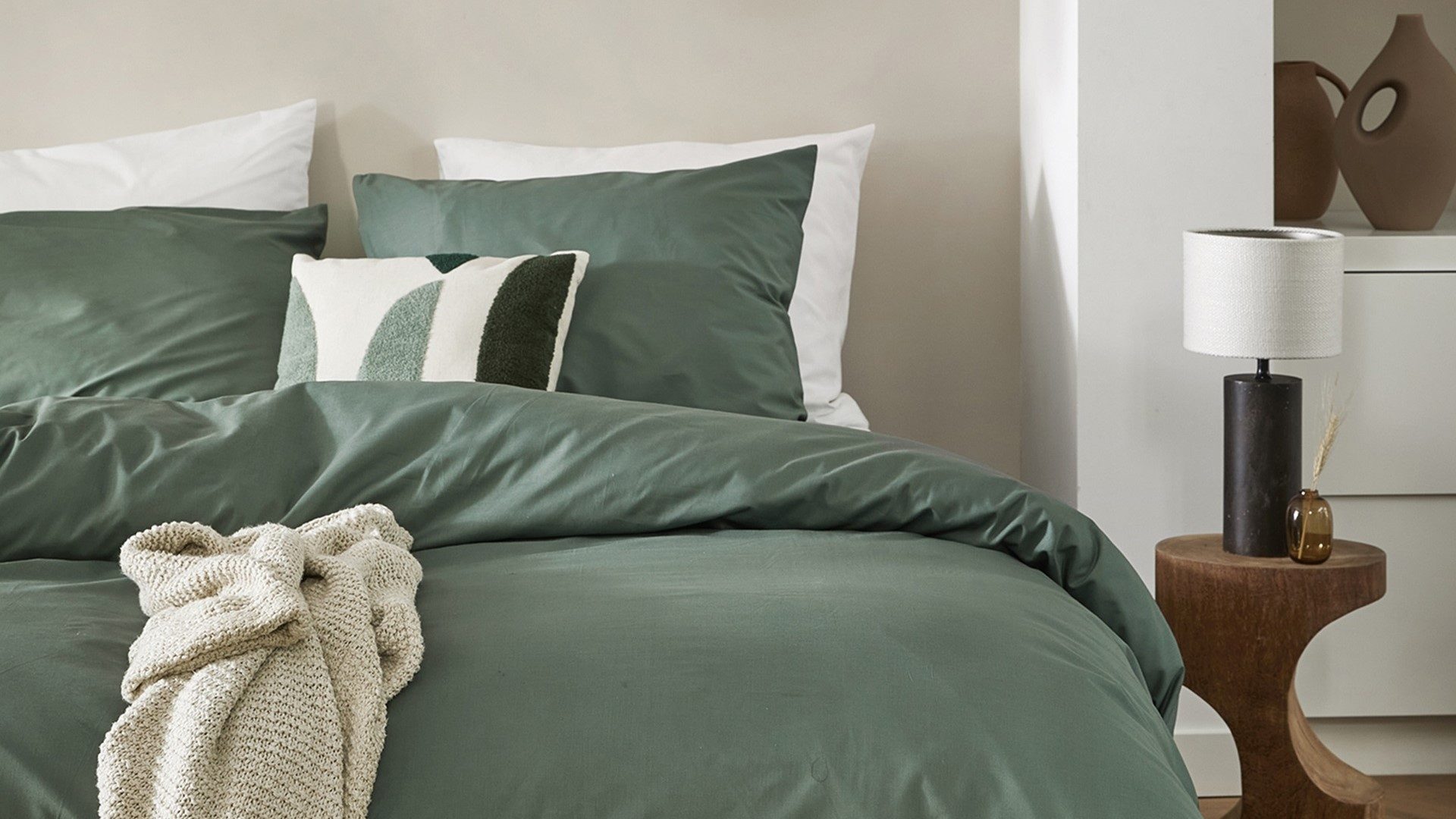 De kleur groen is perfect voor het creëren van een slaapkamer waarin je heerlijk kunt relaxen en ontspannen. Combineer de kleur gemakkelijk met verschillende tinten, zoals grijs, beige en off-white. Ook natuurlijke kleuren en materialen, zoals hout, riet en beton gaan perfect samen met een groen overtrek. Wil je juist een spannend contrast in de slaapkamer? Combineer groen dan eens met rode accenten – ideaal als je nu al de kerstsfeer in huis wilt halen!