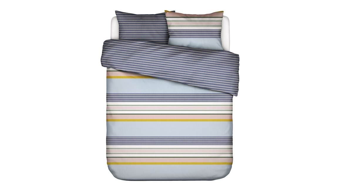 Een dekbedovertrek met strepen is altijd goed! Het Walk the Line overtrek is voorzien van een streepdessin in diverse kleuren. De stoere blauwtinten worden afgewisseld met groen, geel en zachtroze. Door de combinatie van kleuren en de strepen geeft het Covers & Co overtrek je slaapkamer een casual look. De achterzijde van het overtrek is blauw met beige gestreept.