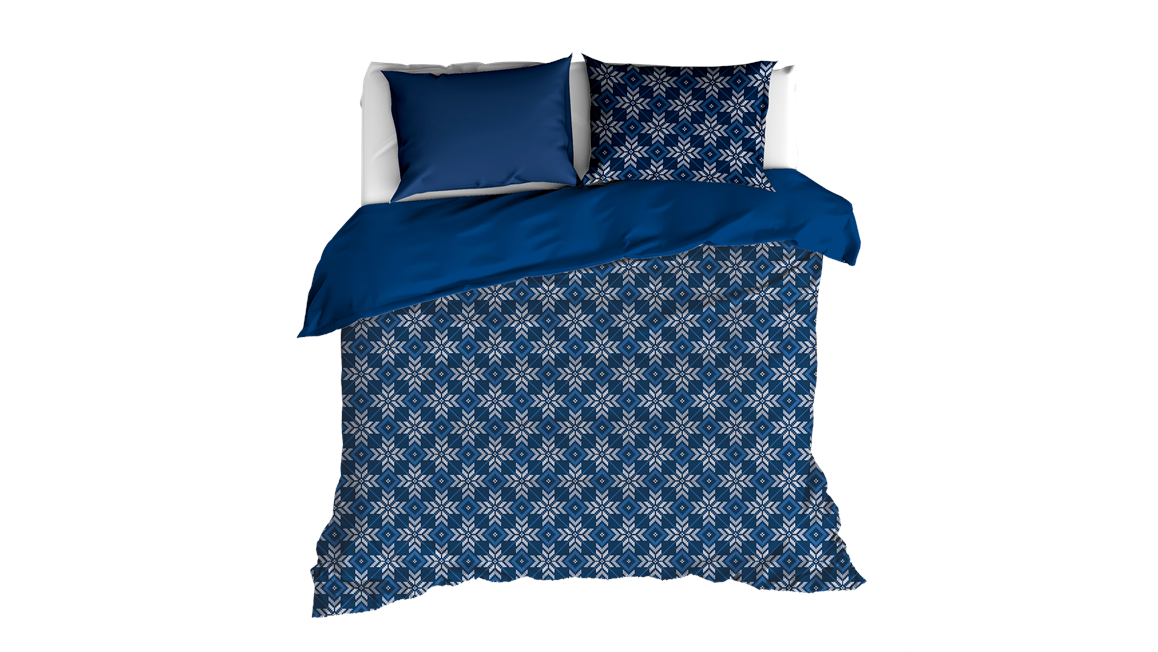 Een bijzondere verschijning het Anzor dekbedovertrek van De Witte Lietaer. Het azuurblauwe overtrek heeft een grafisch patroon. Ruiten en lijnen in diverse tinten blauw worden afgewisseld met lichte vlakken waarbij in het midden de vorm van een ijskristal verschijnt. De prachtige donkerblauwe kleur komt ook terug op de effen gekleurde achterkant en vormt een strakke omslag.