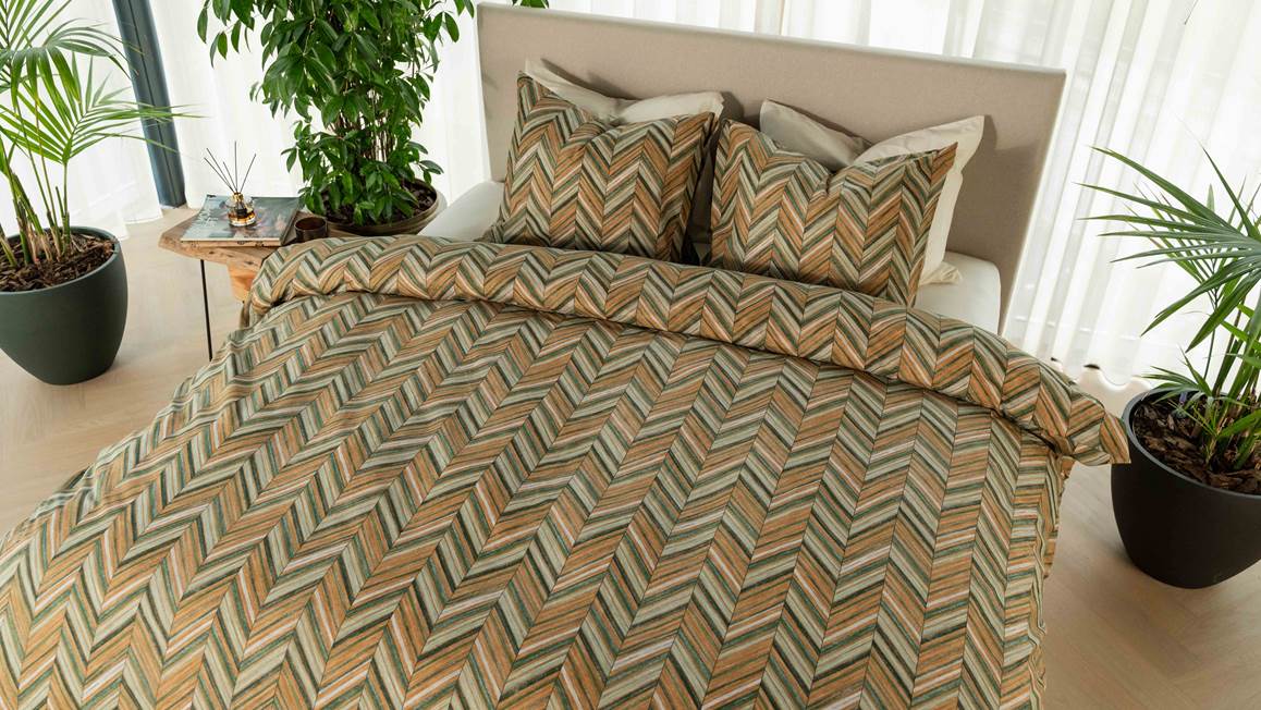 Kies voor net dat beetje extra stijl met het Kayori Dai dekbedovertrek. De grafische print in groen- en bruintinten is tijdloos en oogt erg luxe. Het kleurpallet heeft een rustgevende werking, zodat je heerlijk ontspannen in slaap valt. De print is dubbelzijdig gedrukt en loopt door op de bijbehorende kussenslopen. Zo ontstaat er een prachtig geheel.