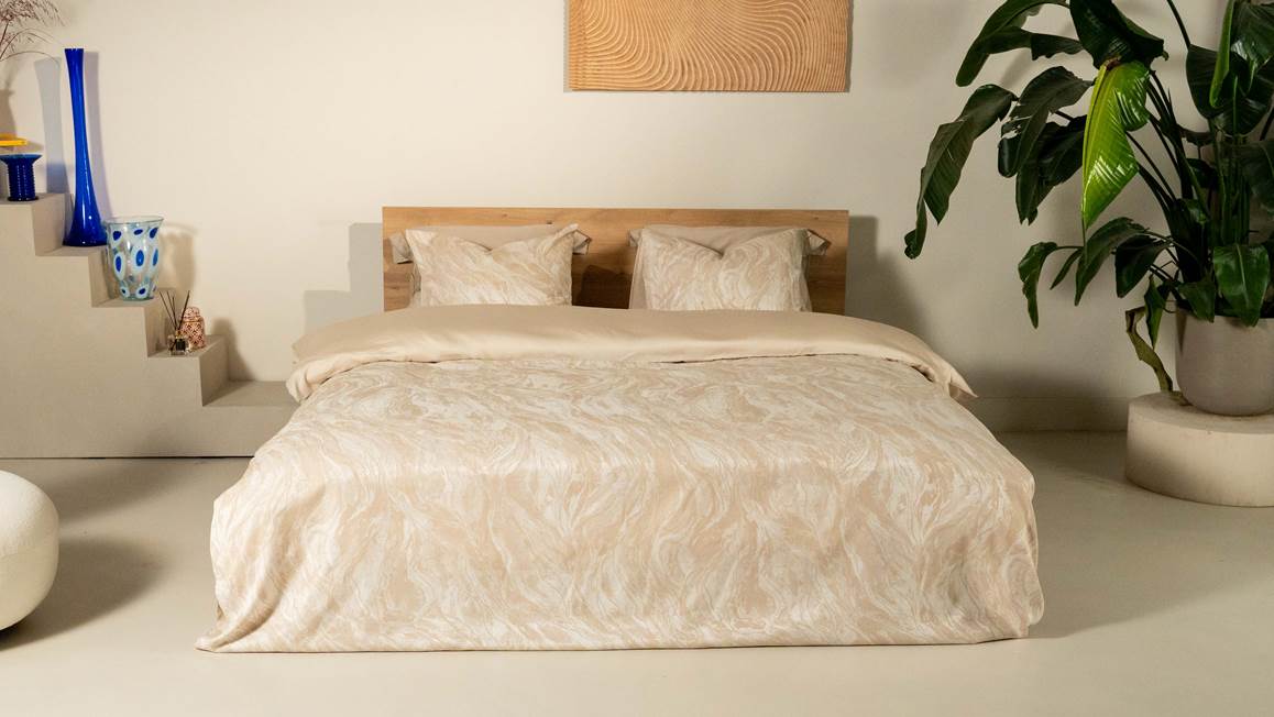 Creëer een oase aan rust in de slaapkamer met het Kayori Nachi dekbedovertrek. Het zandkleurige dessin bevat een grafische print die erg tijdloos is. De tinten vervagen en lopen subtiel in elkaar over, waardoor er een marmeren effect ontstaat. Zo ontstaat er een eigentijds geheel. De achterzijde is effen van kleur, zodat je een luxe en strakke omslag kunt creëren.