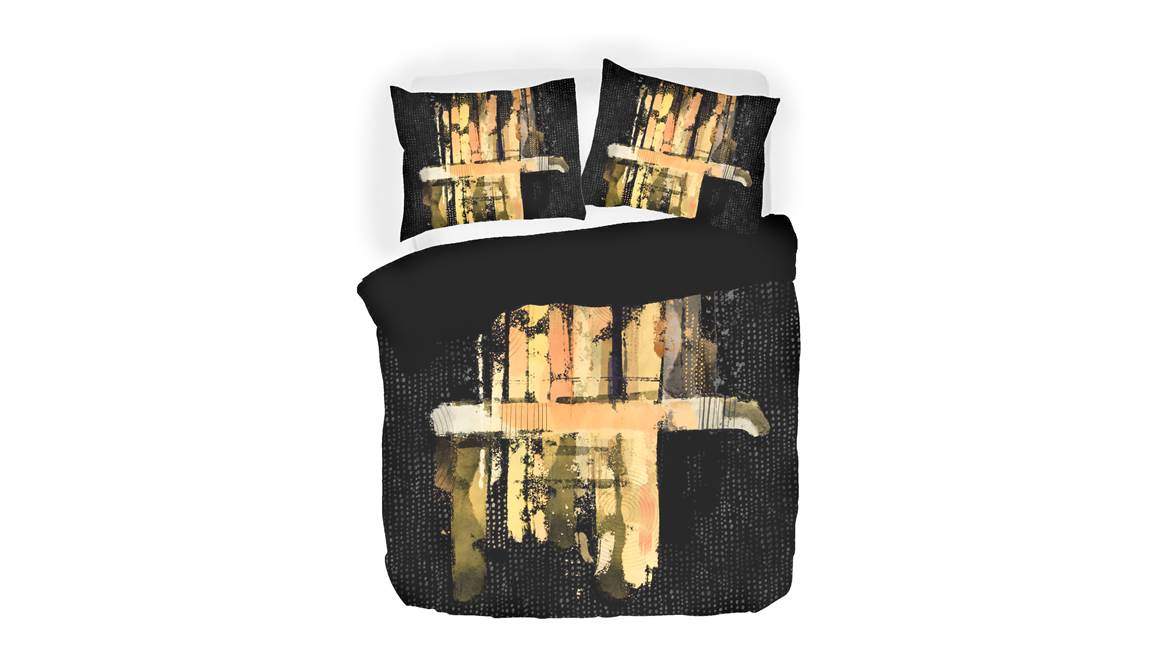 Met het zwarte Sakida dekbedovertrek maak je van jouw bed een echte eyecatcher. Het overtrek heeft een abstract dessin met strepen in gele en oranje tinten met groene accenten. Rondom de print zijn kleine stippen te zien als subtiele details. Door de zwarte ondergrond komt het kleurrijke motief extra mooi uit. De achterzijde heeft een effen zwarte tint voor een strakke en mooie omslag.
