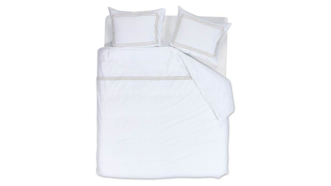 Tover jouw slaapkamer om tot een luxe hotel suite met het Leandro dekbedovertrek van het bekende merk Rivièra Maison. Het witte dessin is voorzien van enkele zandkleurige strepen. Hiermee creëer je een gevoel van rust en kalmte, zodat je iedere avond ontspannen in slaap kunt vallen. De bijbehorende kussenslopen zijn voorzien van dubbele zandkleurige kaders voor een speelse toevoeging.