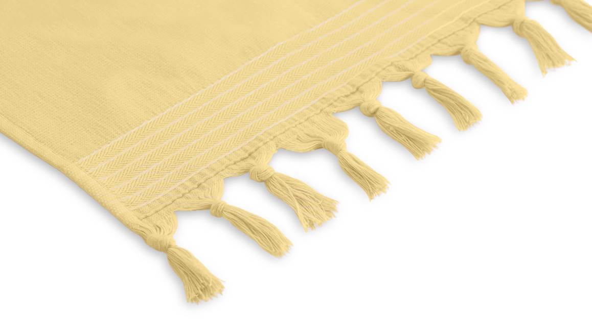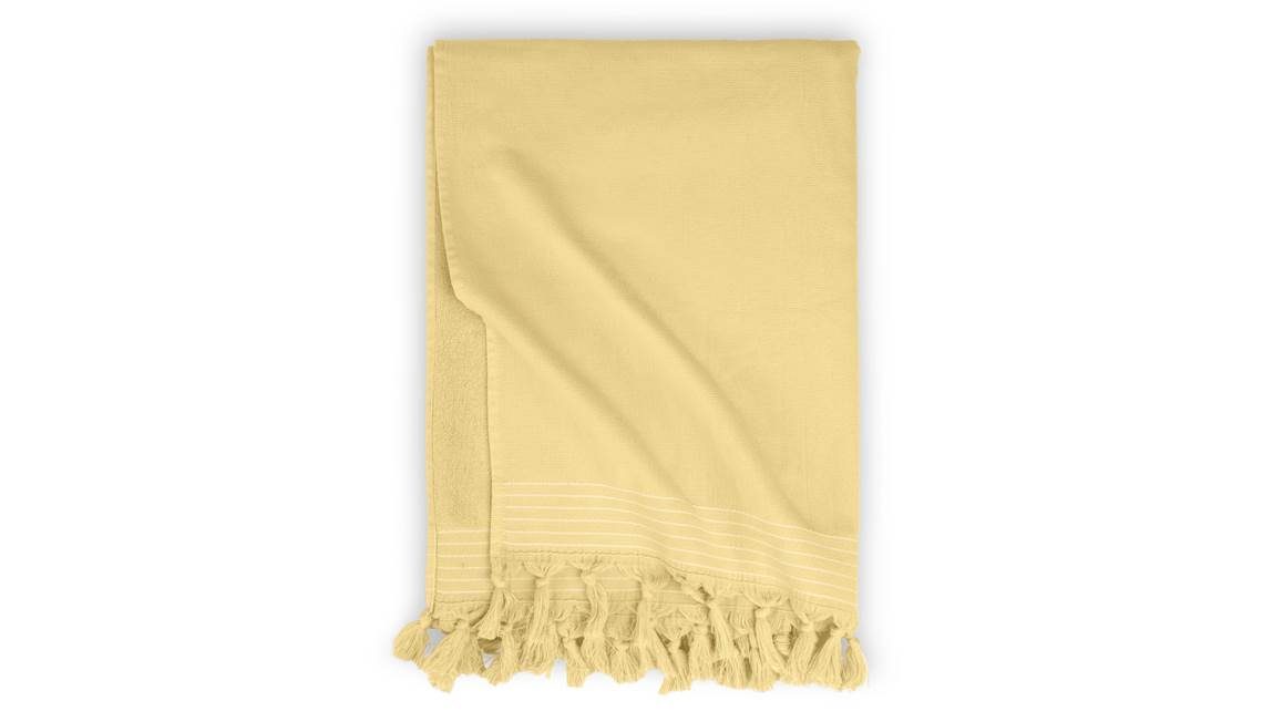 De Soft Cotton hamamdoek in de zomerse gele tint is een vrolijke verschijning. De hamamdoek van Walra is niet alleen te gebruiken als strandlaken, maar ook voor in de sauna of als picknickkleed. De speelse franjes aan de uiteinden en de fijne witte lijnen maken het stijlvolle dessin compleet. Deze multifunctionele en lichte doek neem je bovendien eenvoudig mee in je tas.