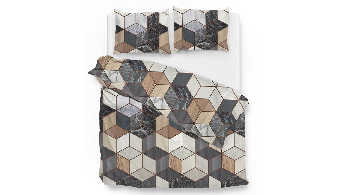 Verschillende natuurlijke materialen worden gecombineerd in het dessin van het Timo dekbedovertrek van Zohome. Zo zie je marmer, graniet en hout op het overtrek in een hedendaags jasje dankzij het geometrische dessin. Het zijn vooral witte, bruine, grijze en zwarte tinten wat zorgt voor een moderne uitstraling.